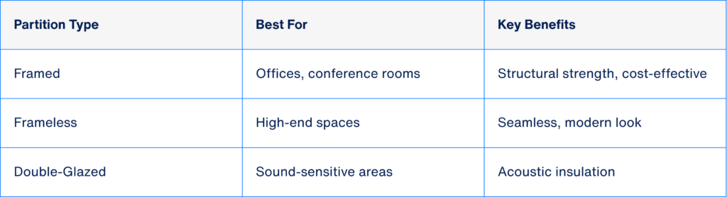 Frameless Glass Partitions – Perfect for a minimalist aesthetic. We use high-grade toughened glass with discreet channels and silicone joints for a seamless, high-end look.